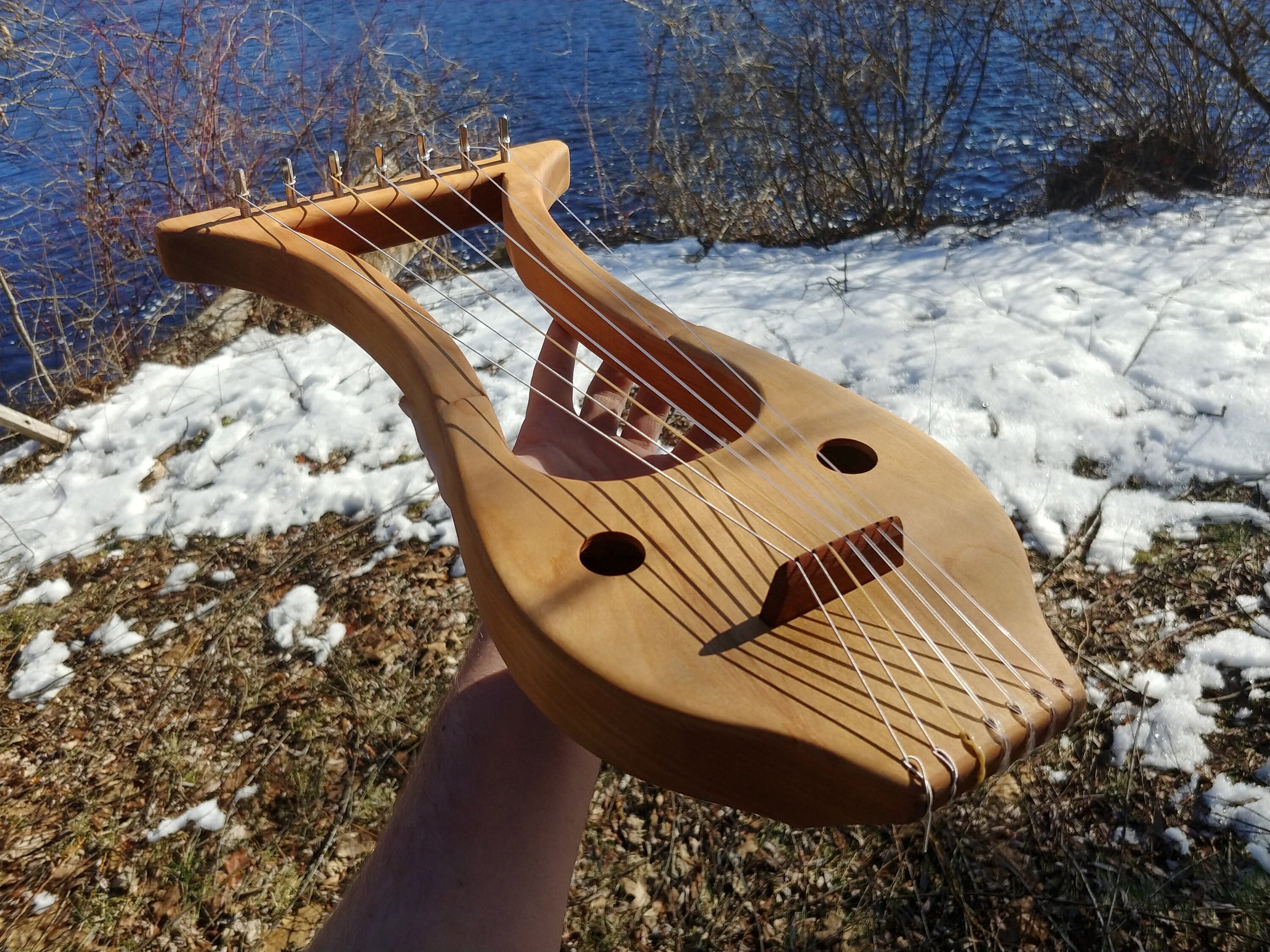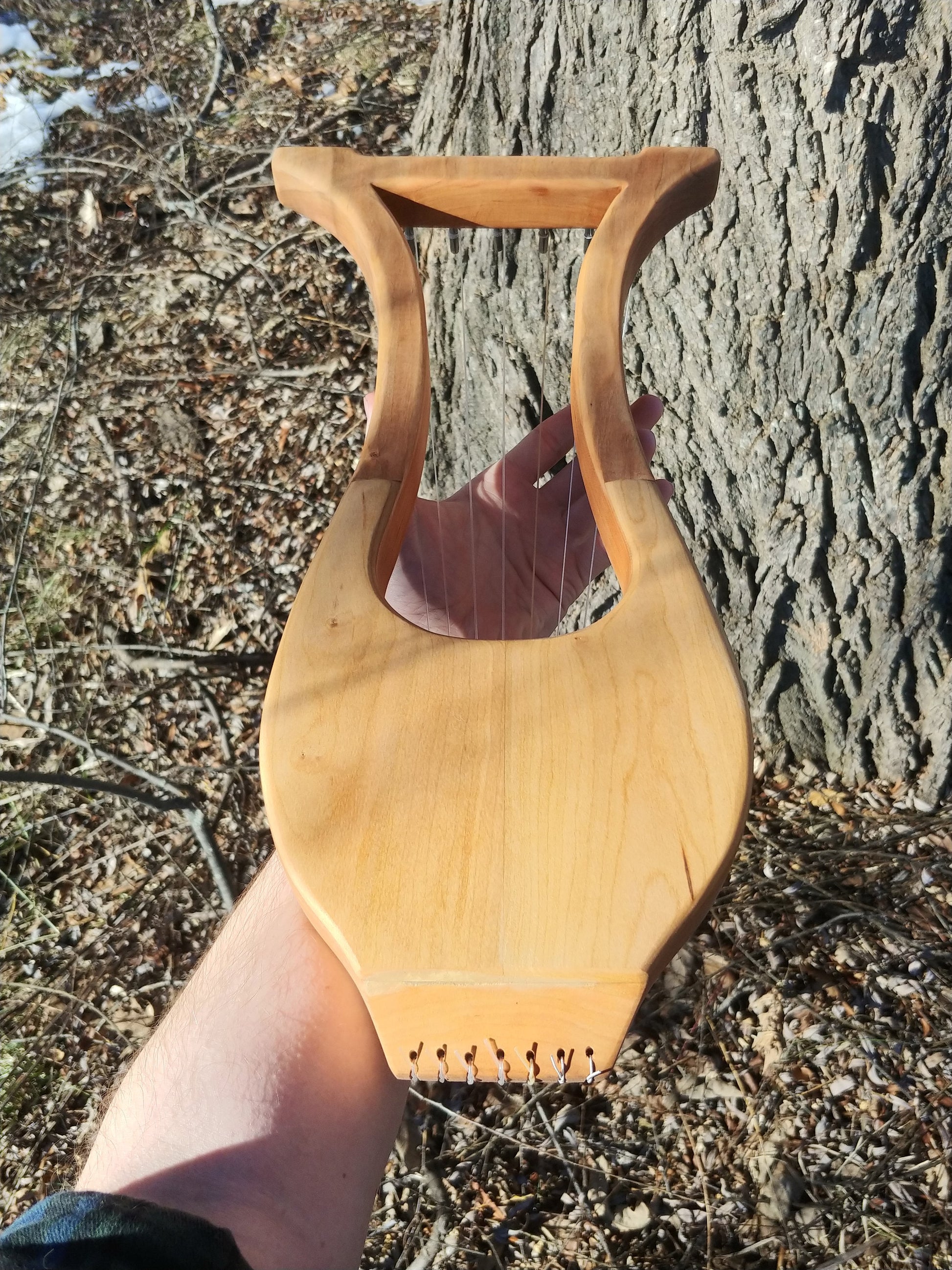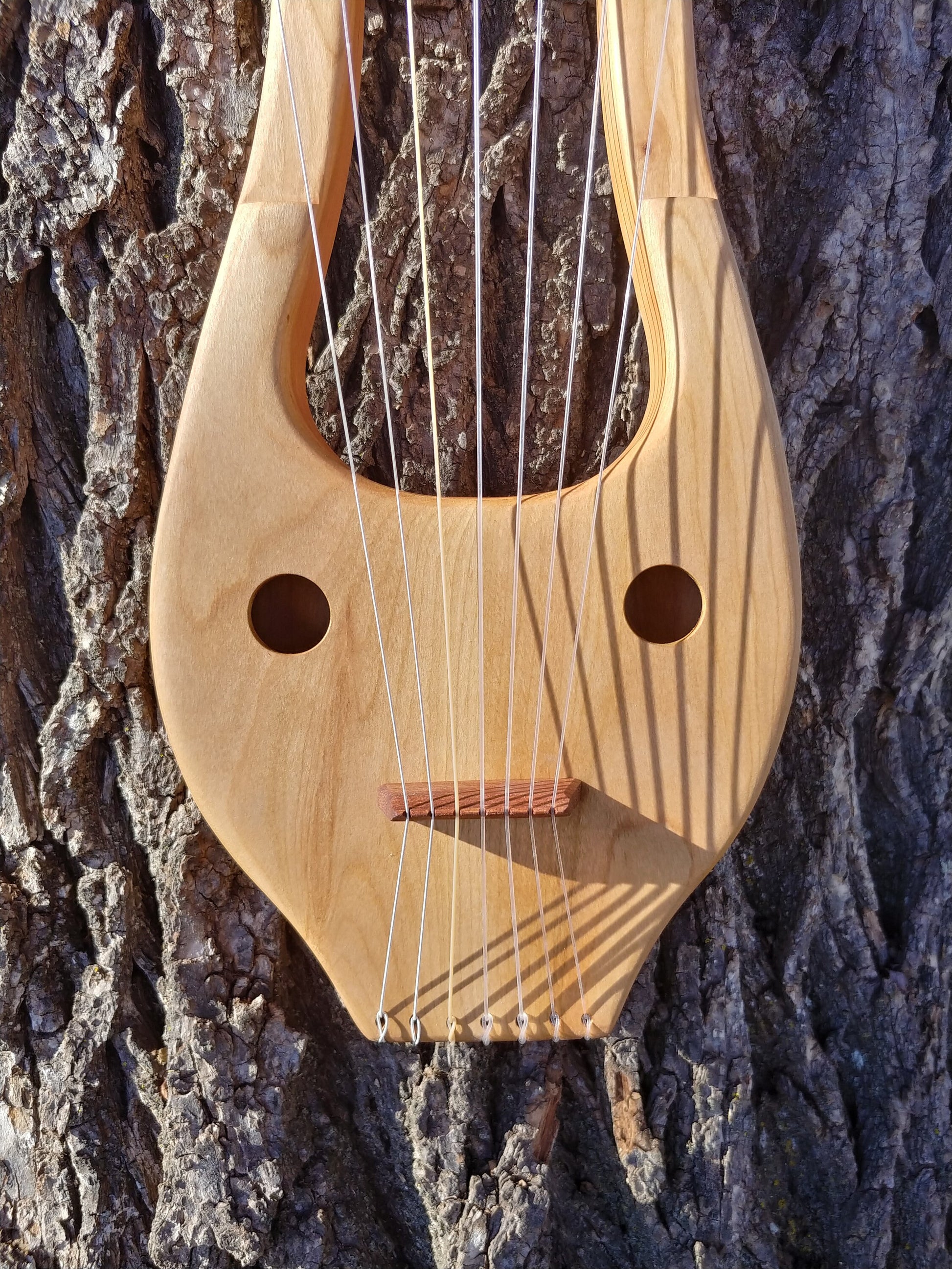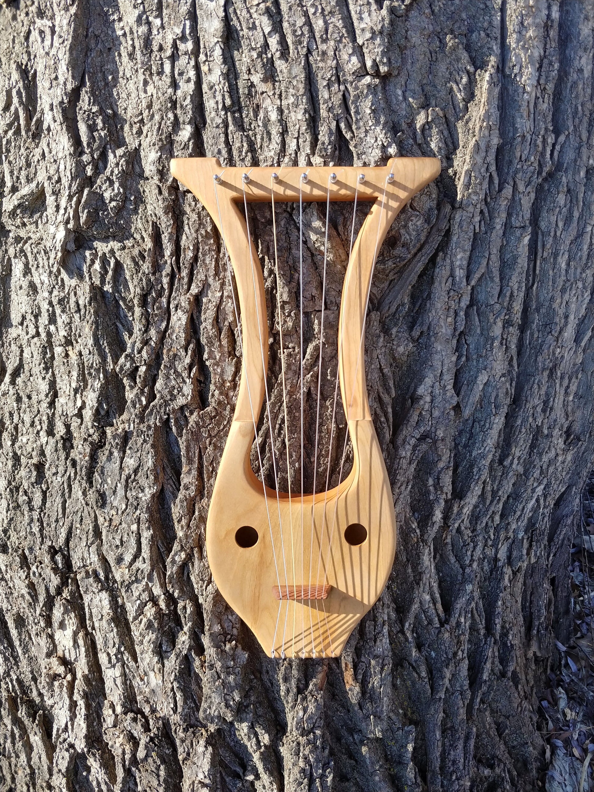 This greek and celtic inspired lyre is tuned E3 G A B C D E, offering plenty of range. It's furnished with modern harp nails for easy tuning, and has a mellow, easy sound, with a bit of twang. It's best played in small interior spaces alongside other acoustic instruments and bardic verse. It's strung with nylon and silver-wound composite strings, optimized for tension and tone. The piece comes with a tuning key and informational pamphlet.